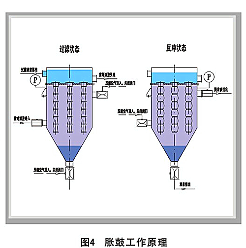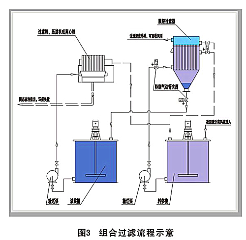 胀鼓管式过滤器(见图2)主要由筒状壳体、列管栅板、袋状滤膜、膜支撑笼架,以及配套的气动控制阀、排气阀、液位计、压力表和自动控制系统等组成。它是针对低含固量的料浆分离而独特设计的,能对分离后水质进行进行有效控制,可与各种真空过滤机、板框压滤机或转筒离心机等进行组合过滤,以降低滤渣含水量,从而充分利用不同分离技术的各自优点,克服不足之处,通过合理组合和自动按序切换,达到高效、节能、连续工作的目的(见图3)。